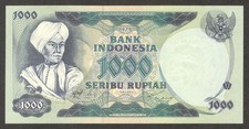 1992/1994. Deep blue on light blue and multicolored underprint. Aerial view of Lake Toba at left center. Arms at upper right area. Stone jumping attraction on Nias Island at center on back. Watermark: Cut Nyak Meutia. Second date appears after imprint.