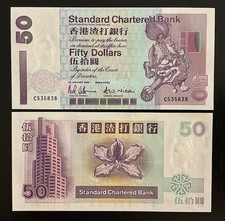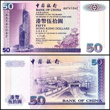 1.5.1994 - 1.1.2000. Hong Kong Special Administration Region Bank of China (Hong Kong) Limited. Purple and blue on violet and multicolored underprint. Bank of China Tower at left. Chrysanthemum flowers at lower center right. Aerial view of cross-harbor tunnel at center right on back. Watermark: Chinze. Printer: TDLR (HK) Ltd (without imprint). As a specimen banknote.