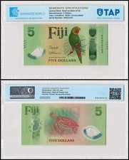Not dated (issued in 2025). Polymer plastic banknote. Green on multicolored underprint. Endemic Kulawai (Red throated Lorikeet) at right, arms at upper right. Transparency window at left. Back: green sea turtle ("Vonu Dina") swimming through sea grass at center. As a banknote without a presentation folder.