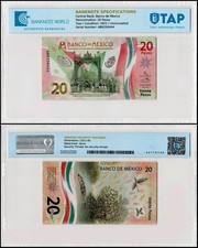 31 MAR, 2021 (31st of March 2023). Olive green on green underprint. The front of the banknote is a representation of the beginning of Mexico’s War of Independence, with the image of Miguel Hidalgo y Costilla, a priest who, on September 16, 1810, called upon the population through what is popularly known as “el grito de Dolores” (Cry of Dolores) and started the independence movement; and, the image of José María Morelos y Pavón, who assumed the leadership of the independent movement after the death of Hidalgo and is known as the “Siervo de la Nación” (Servant of the Nation). The images of Hidalgo and Morelos appear along with a vignette representing the “Campana de Dolores” (Bell of Dolores), which was used to call upon the population and start the independence movement in Dolores, Hidalgo. The back of the banknote features the image of a royal eagle on this side of the banknote represents Mexico’s scrubland and desert ecosystem found at the Pinacate and Gran Desierto de Altar Biosphere Reserve in Sonora, designated by UNESCO as World Heritage Site.
