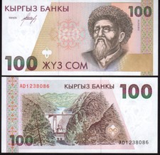 ND (1994). Dark brown on multicolored underprint. Toktogul at right and as watermark. Hydroelectric dam at left center on back. As a specimen banknote.