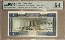 ND (1971). Blue and brown on multicolored underprint. Oil refinery at center. Entry to the al-Mustansiriyah School at center, 1 Dinar at left on back. Two signature varieties. Watermark: Falcon's head.