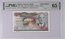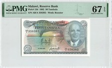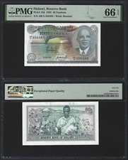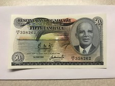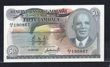 1.5.1982. Blue-gray on multicolored underprint. Portrait of Dr. Hastings Kamuzu Banda as President at right. Cotton harvest on back. Watermark: rooster.