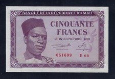 22.9.1960. Green on multicolored underprint. President Modibo Keita at left, two farmers plowing with oxen at right. Market scene and building on back.