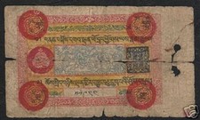 ND (1942-1946). Blue and red on yellow underprint. Lion at center. Two lines of text. Back: red and light blue. Fountain between dragons. These notes were made by pasting together three sheets, the middle one having a two line security legend printed on it.