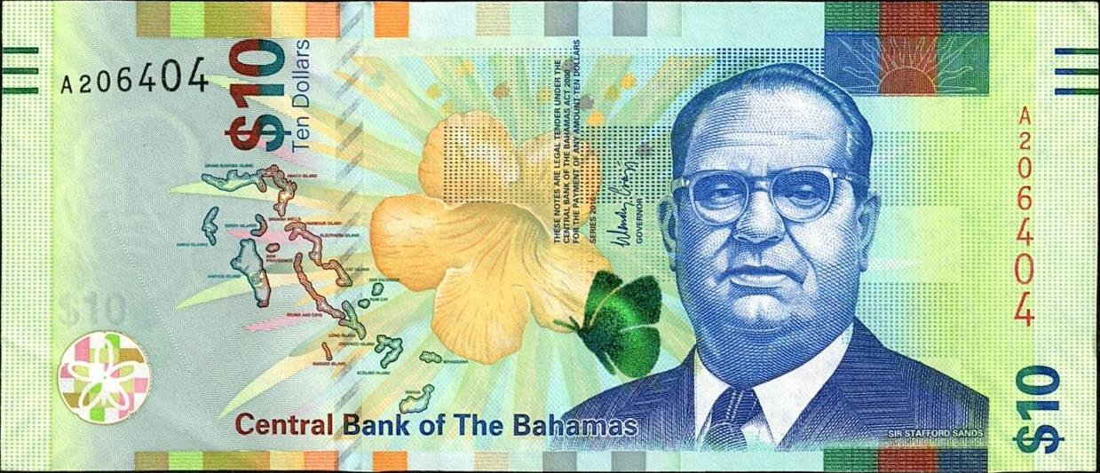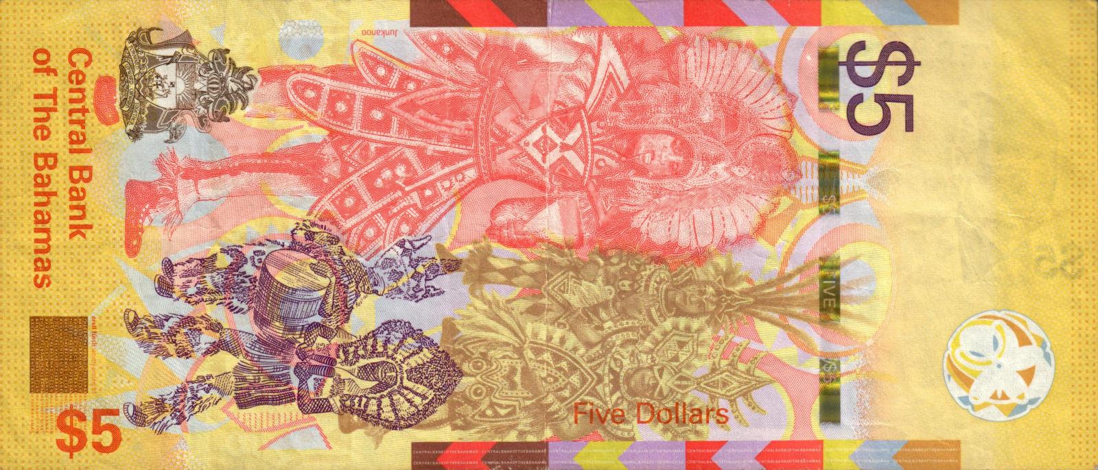 Series 2019. Predominantly yellow with shades of red, lilac, green, and blue, the banknote measures 156 mm long and 67 mm wide bearing on the front a portrait of Sir Cecil Wallace-Whitfield, the series, and the signature of the Governor of the Central Bank of The Bahamas, together with the words “Central Bank of The Bahamas. These notes are legal tender under the Central Bank of The Bahamas Act 2000 for the payment of any amount Five Dollars”. A watermark of Sir Cecil Wallace-Whitfield and the numeral $5, a replica map of the Islands of The Bahamas, and the denominational value in words and figures appear on the left, with an image of a hibiscus flower in the center. The back features Bahamian Artist Delton Barrett’s likeness of a Junkanoo cowbeller in full costume, with accompanying junkanooers adjacent. The numeral $5 appears in the upper left and lower right corners, while the words “Five Dollars” are in the upper right quadrant. Just below the cowbeller is the Coat of Arms of The Commonwealth of The Bahamas along with the words “Central Bank of The Bahamas”.
