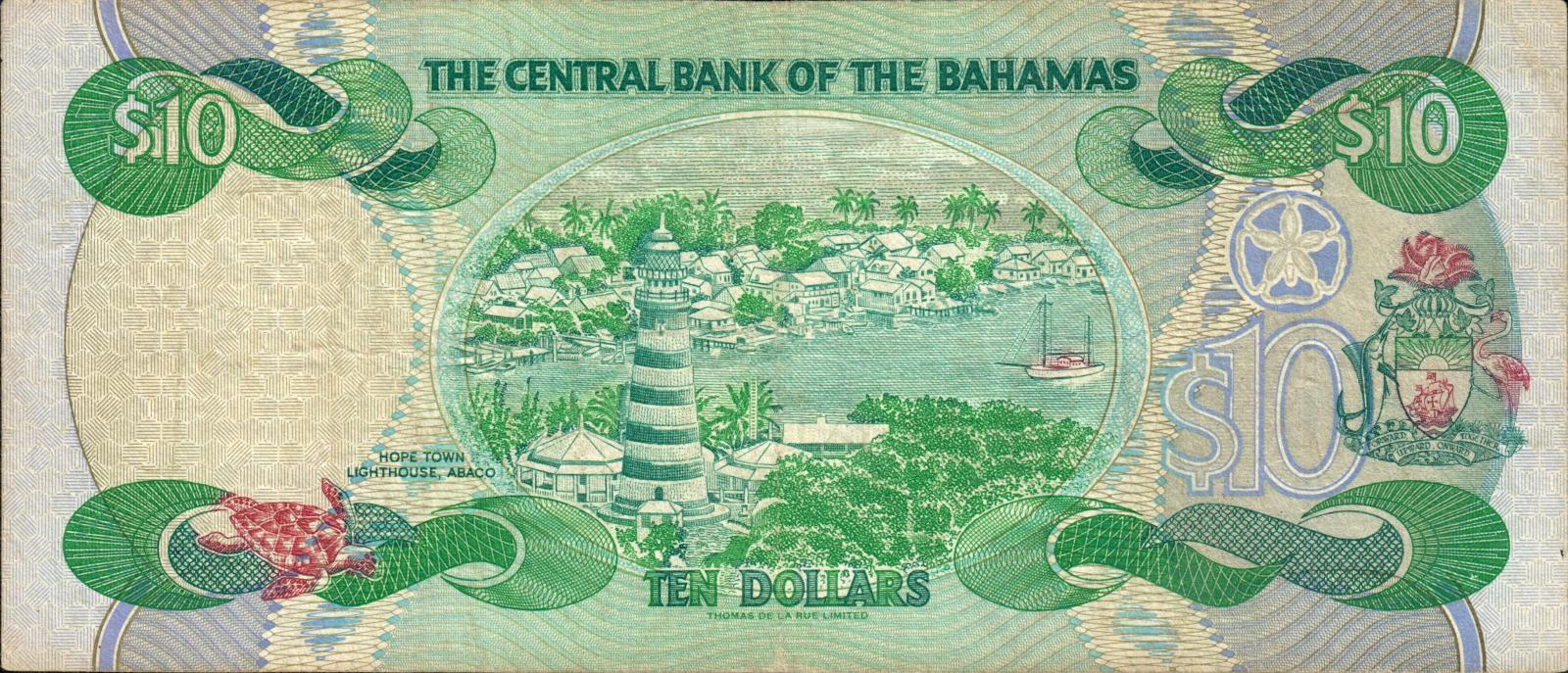 Deep blue-green, green, and violet on multicolored underprint. Two flamingos at left. Lighthouse and Abaco settlement on back. Serial number vertical and horizontal.