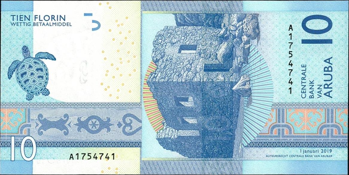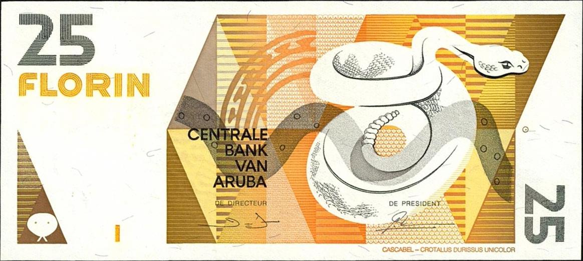 Geometric forms with pre-Columbian Aruban art on back. Watermark: stylized tree. Printer: JEZ.