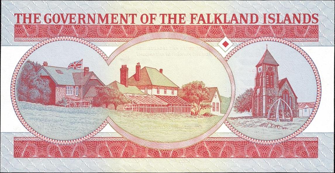 14.6.2005. Red on multicolored underprint. Seals at right, island map at center, Queen Elizabeth II at right center, king penguins at left. Three signatures. Back: government house and Christ church cathedral at Stanley. Like p12 but without a commemorative legend.