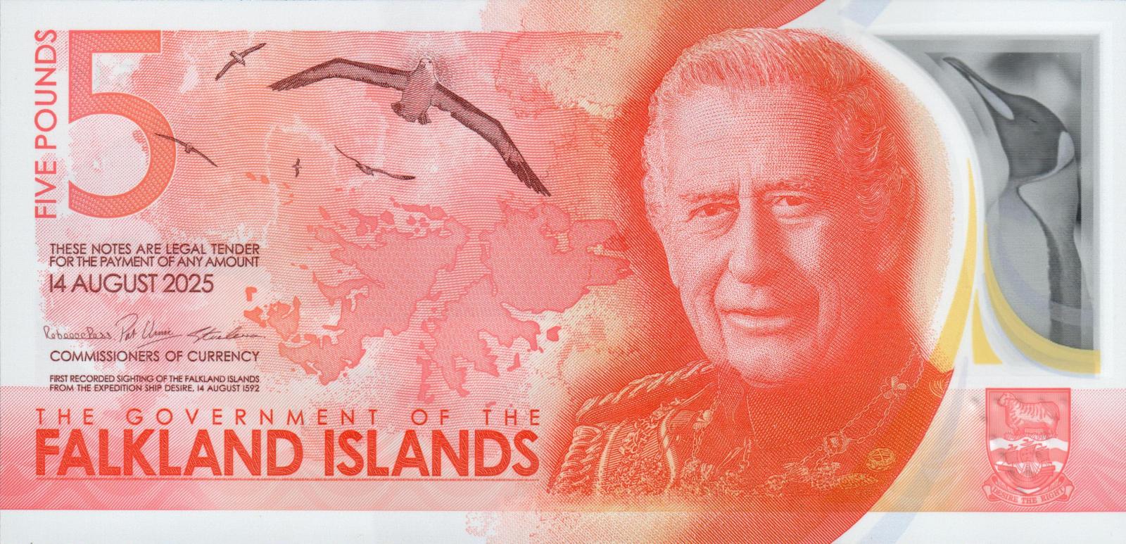14 AUGUST 2025. Red on pink and orange underprint. King Charles III at right, map of the Falkland Islands in the background at center left, flying birds above. Back: island and surf at right, flowers at center left, five penguins at bottom left.