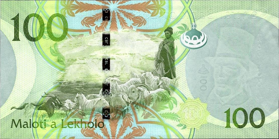 2010. Green on multicolored underprint. Portraits of kings Moshoeshoe II, Letsie III, and Morena Moshoeshoe I. Back: goats.