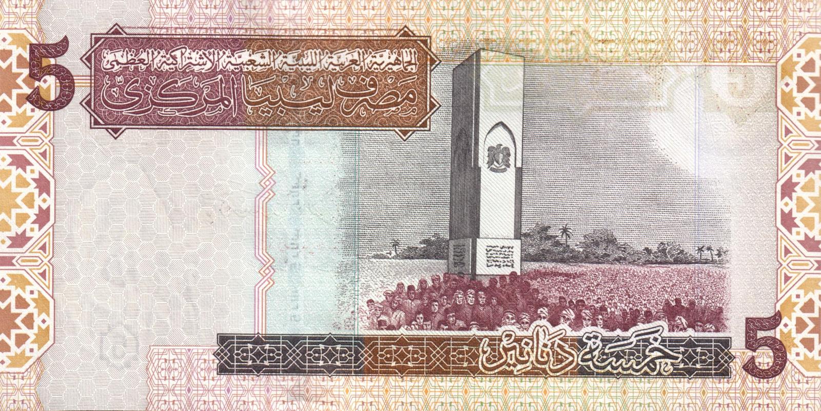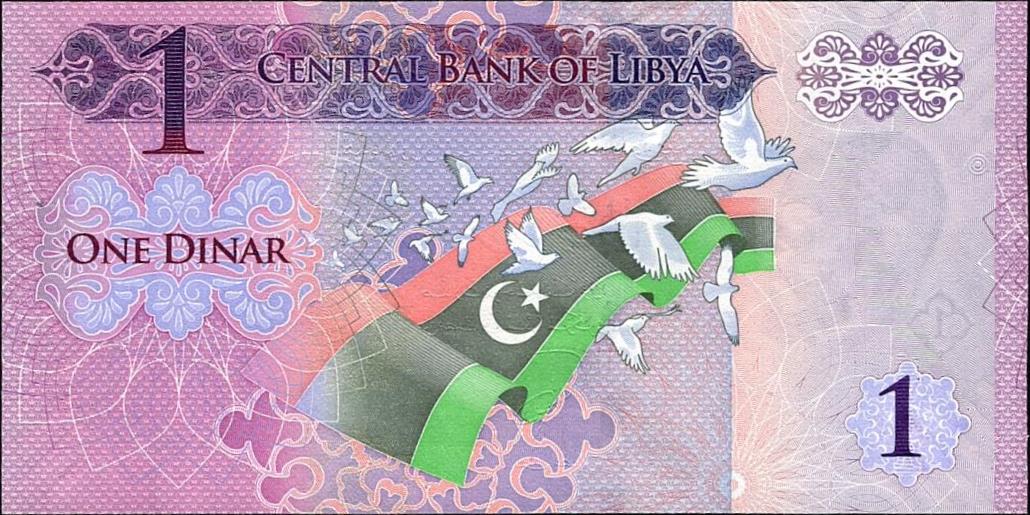 ND (2013). Purple, violet and multicolored. Citizens with flags in celebration at lower right. Cornerstone devices. Back: Libyan flag and flock of doves. Watermark: Omar al-Mukhtar and value. Printer: DLR.
