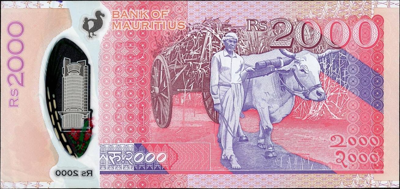 2013. Violet and brown on multicolored underprint. Coat of arms, Milin Jean ah-Chuen. Building facades at center. Back: dodo bird, building facade, Rodrigues Island map. Polymer plastic.