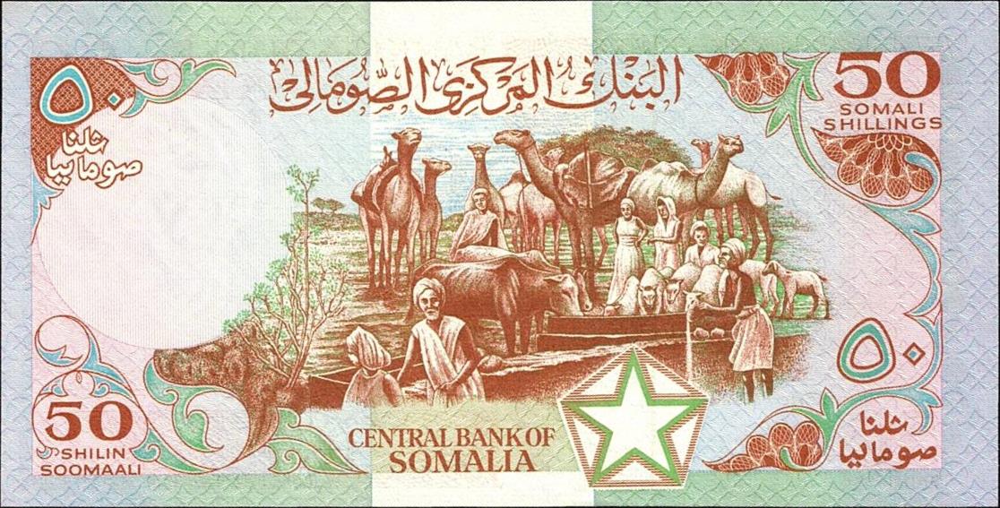 1983. 50 Shilin = 50 Shillings. Red-brown and multicolor underprint. Walled city at left and center, arms at top left center, star near lower center. Back: Watering animals at center right. Watermark: Sayyid Mohammed Aabdullah Hassan. Reduced size. Replacement notes: Serial number prefix Z001.