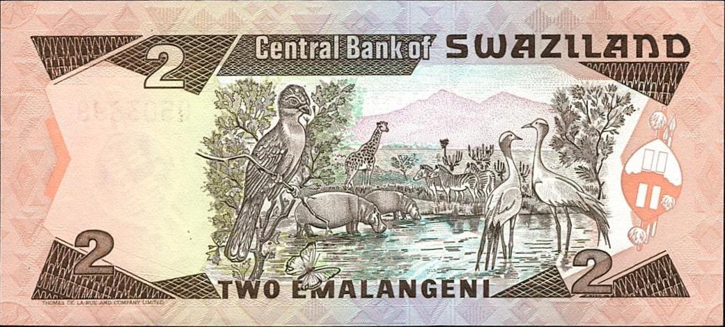 ND (1992). Dark brown on multicolor underprint. Older portrait of King Mswati III at left facing half right, arms at lower center. Back: Grey lourie, blue crane, hippos and other wildlife. Watermark: Shield and spears. Printer: TDLR. Replacement notes: Serial number prefix Z.