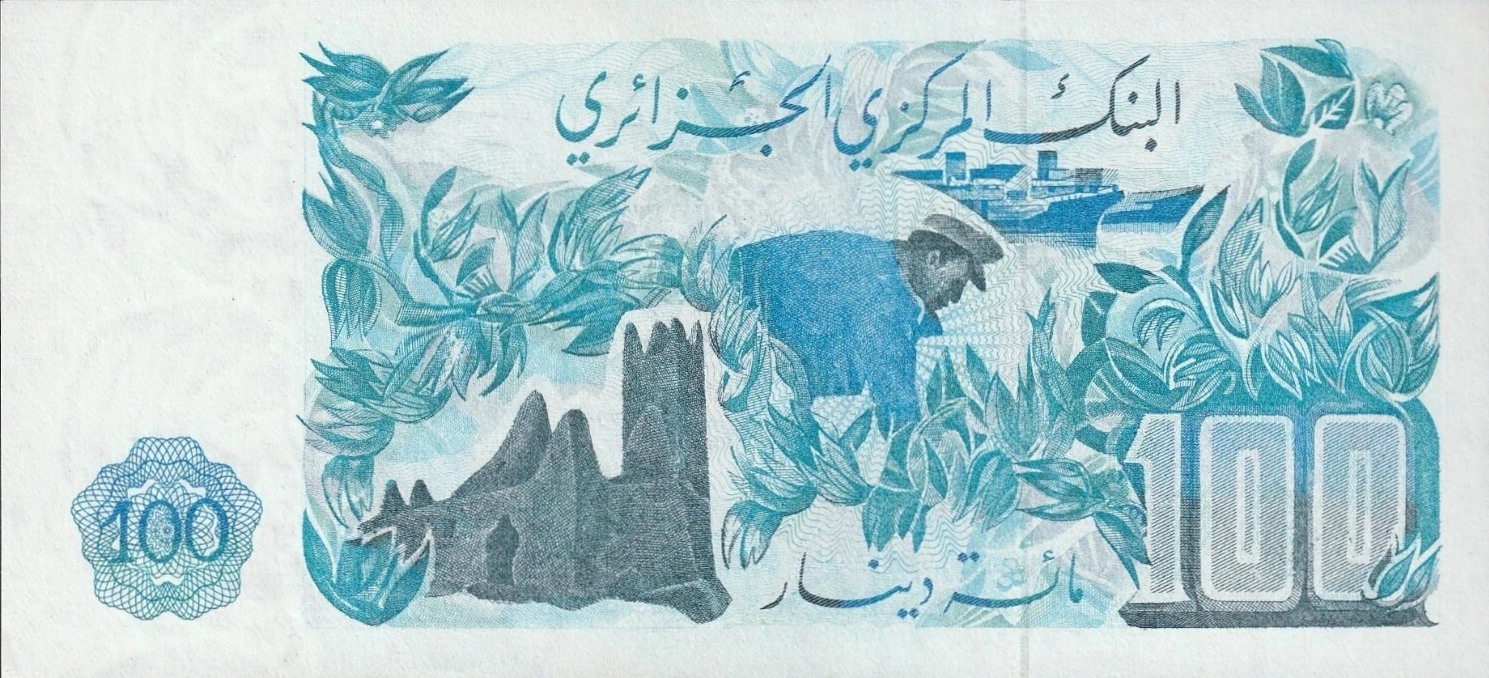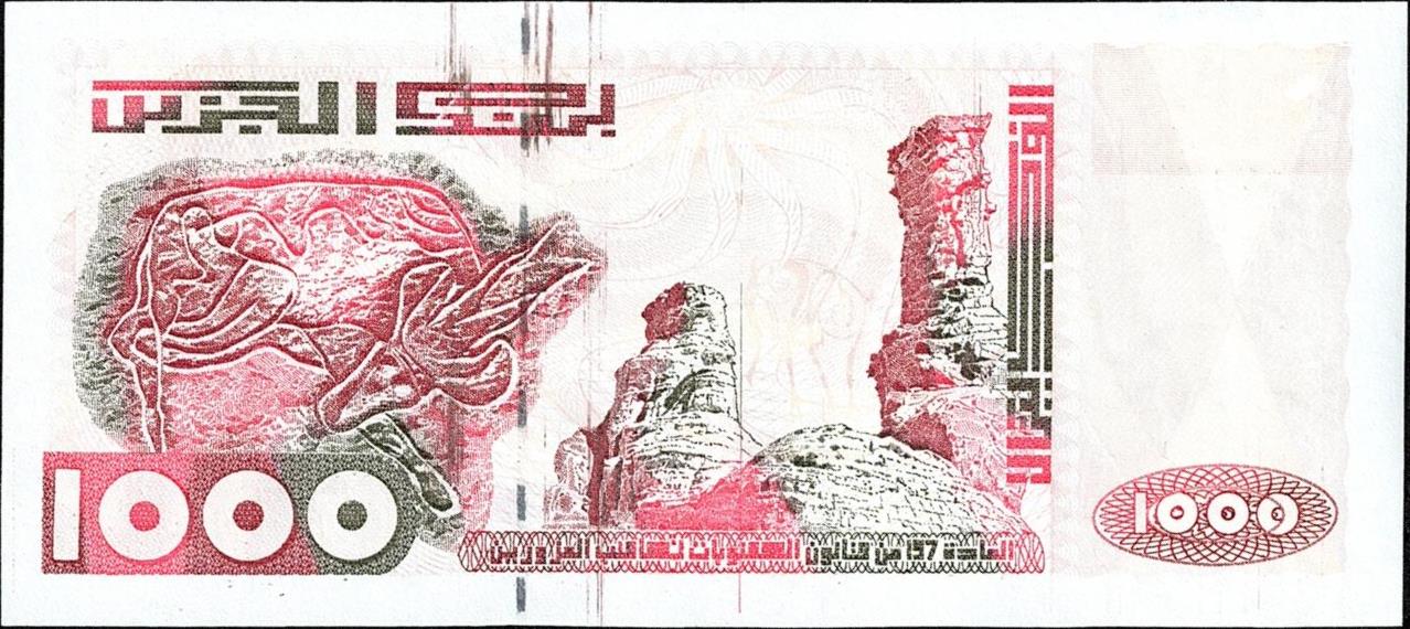 Red-brown and multicolored. Sheep at left, peacock at right. Seated elderly man at left, ornate building right on back. Minor plate varieties in French text on back. Watermark: Amir Abd el-Kader. Penal code in sans serif font. Series 15-054.