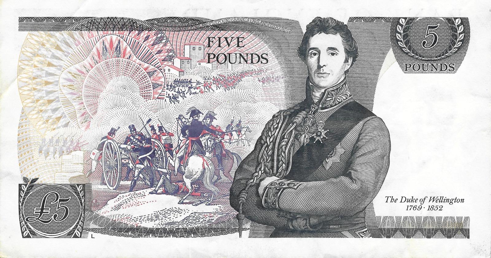 ND (1980-1987). Blue-black and blue on multicolored underprint. Portrait of Queen Elizabeth II in court robes at right. Duke of Wellington at center right, battle scene in Spain at left center on back and in watermark. Black signature. Thin security thread.