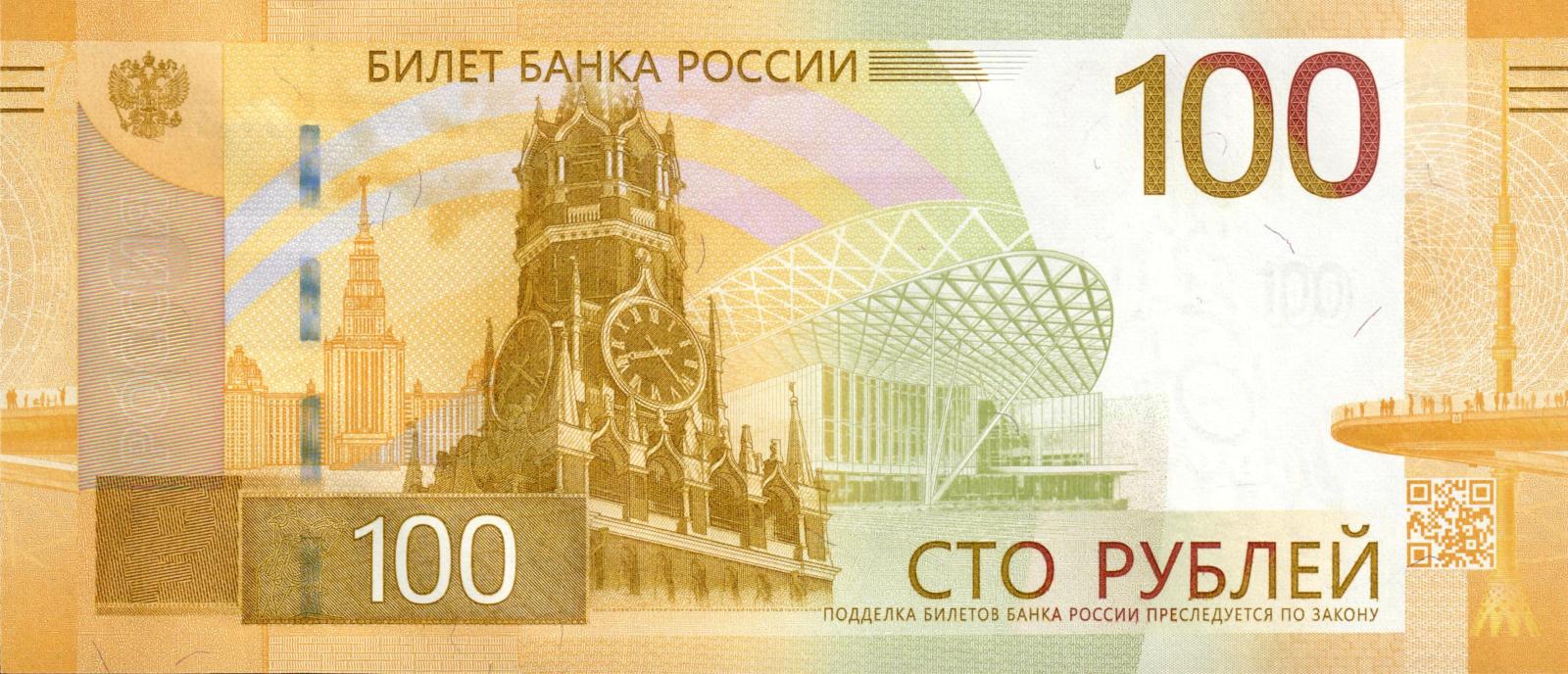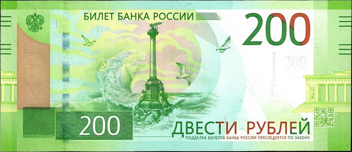 2017 (12.10.2017). Green on multicolored underprint. Coat of arms of the Russian Federation at top left on face. Front of the banknote features the "Monument to Sunken Ships" in Sevastopol, and a QR code at the bottom right which leads to the website of the Bank of Russia. The back of the banknote features the State Museum-Preserve of Tauric Chersonese. Year of issue is in the underprint at the top right on the back.