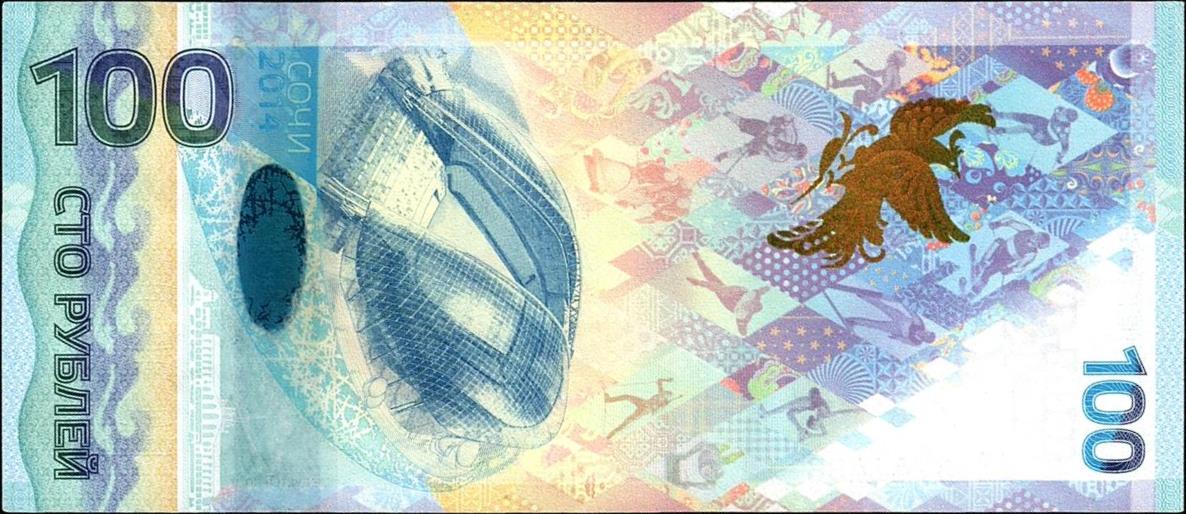 2014. Vertical format. Serial number prefix "AA". Blue, purple, green and orange on multicolored underprint. Snowboarder, mountains, olympic venues in Sochi. Back: Fischt Stadium in Sochi, skier, ski jumper, skaters, hockey player, curler, bobsled team. Printer: Goznak.