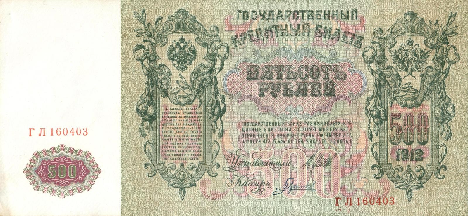 (1912-1917). Dark brown on light brown and multicolor underprint. Back: Allegorical man with sword, Catherine II at left. Watermark: Value.