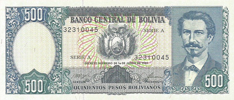 1.6.1981. Deep blue, blue-green, and black on multicolored underprint. Arms at center, portrait of Eduardo Avaroa at right and as watermark at left. Back blue on multicolored underprint. View of Puerto de Antofagasta, circa 1879 at center. Series A. Printer: ABNC. 2 Signature varieties.