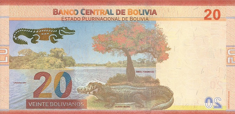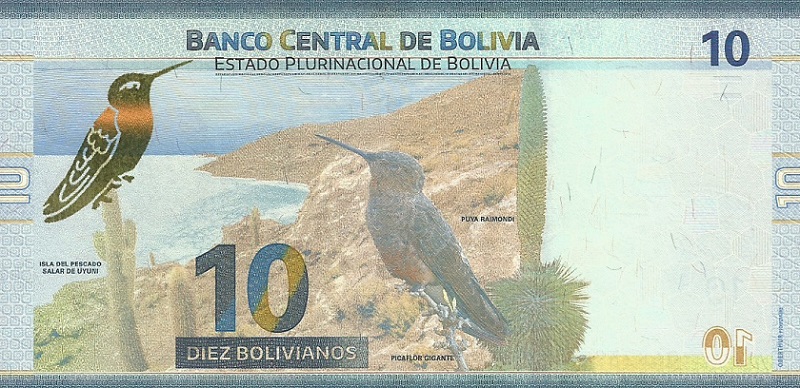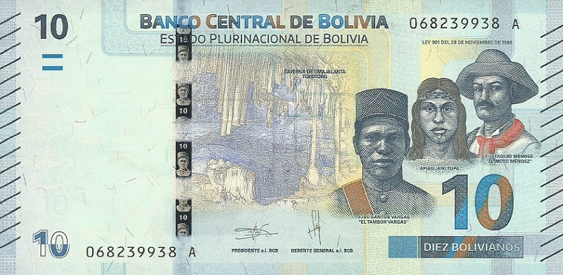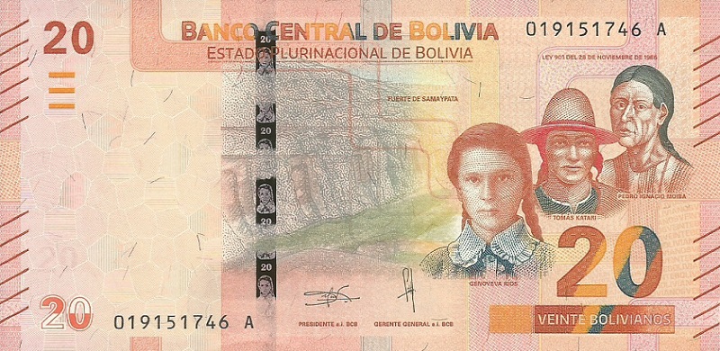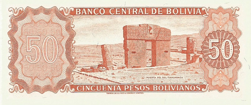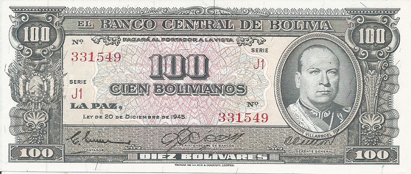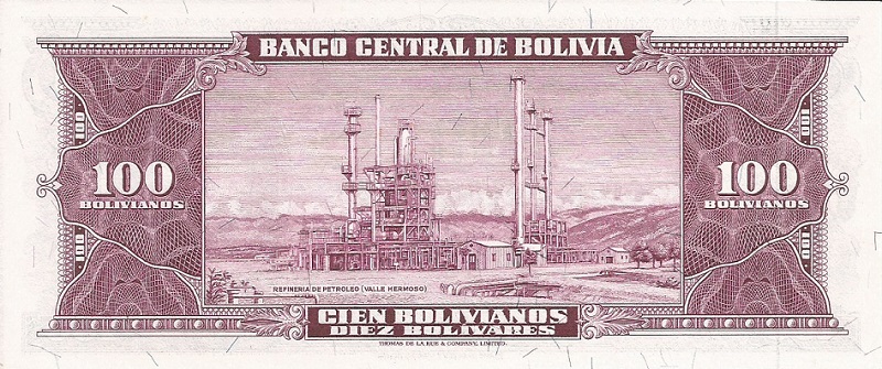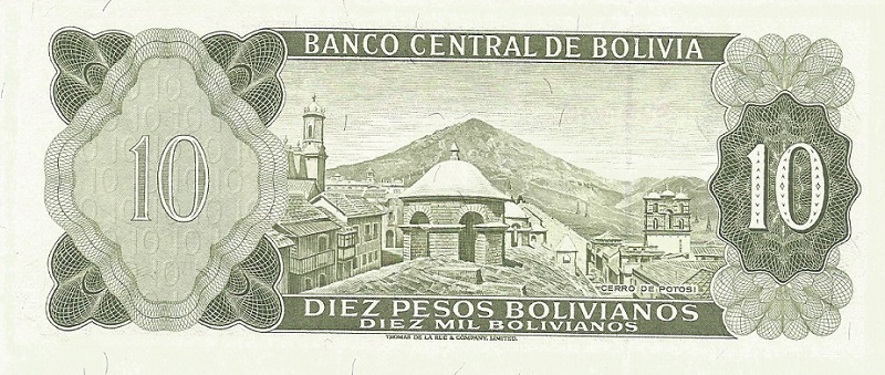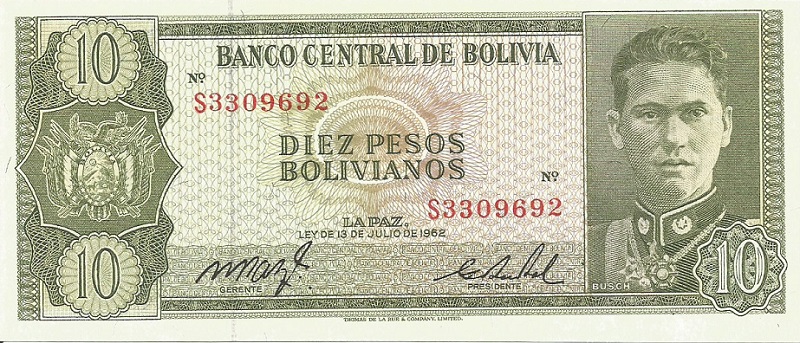 Law of 1962. Olive green on multicolored underprint. Portrait of Colonel German Busch Becerra at right. Mountain of Potosi on back. Series A-U3. 18 Signature varieties.