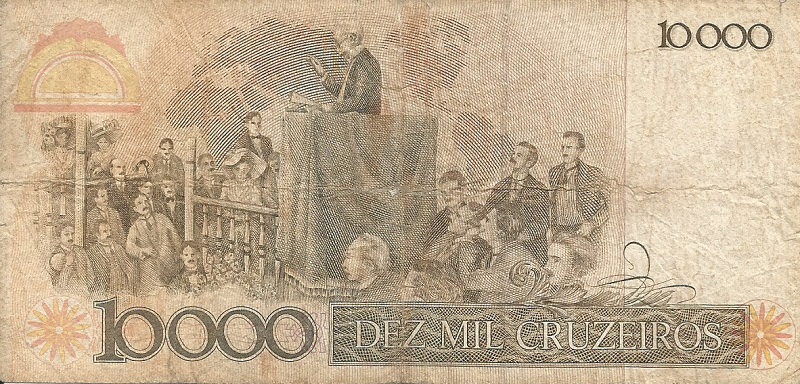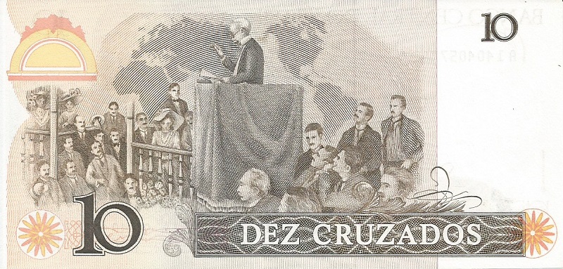 ND (1986). Brown on multicolored underprint. Desk top at center, Rui Barbosa at center right. Conference scene on back. Black circular overprint: Banco Central Do Brasil and new currency unit. 10 Cruzados on 10000 Cruzeiros.