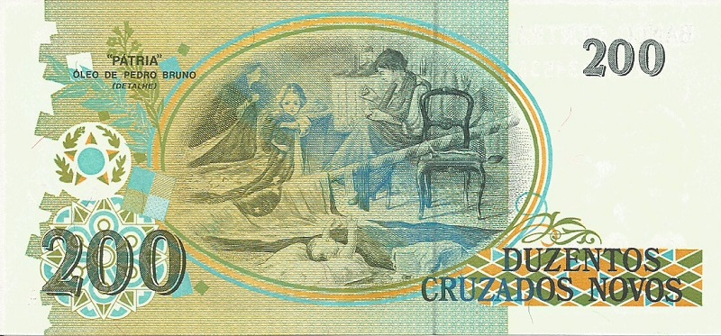 ND (1990). Blue and black on multicolored underprint. Political leaders at center, sculpture of the Republic at center right, arms at right. Oil painting Patria by P. Bruno with flag being embroidered by a family on back. Series 1965-2668. Black rectangular overprint of new currency unit. 200 Cruzeiros on 200 Cruzados Novos.