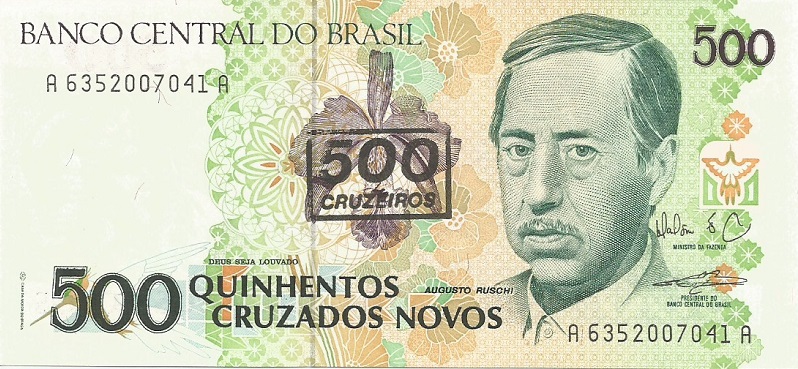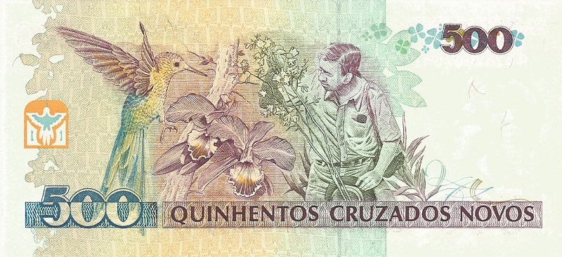ND (1990). Green and purple on multicolored underprint. Orchids at center, A. Ruschi at right. Back light orange, purple, and blue; swallow-tailed hummingbird, orchids and A. Ruschi at center. Black rectangular overprint of new currency unit. 500 Cruzeiros on 500 Cruzados Novos. Series 3701-7700.