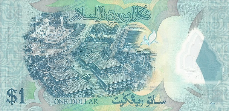 2013. Dark and light blue on multicolored underprint. Sultan Hassanai Bolkiah at right. Back: Bandar Seri Begawan at center. Polymer plastic.