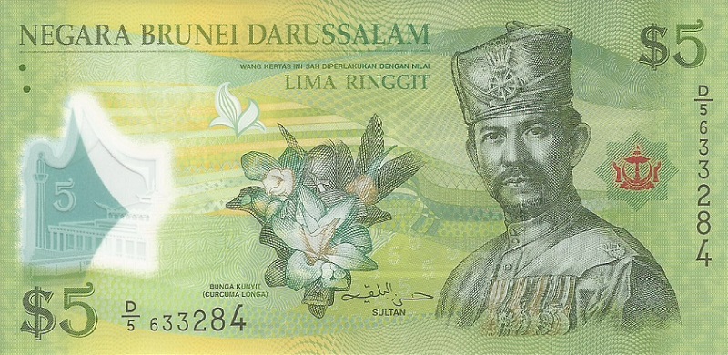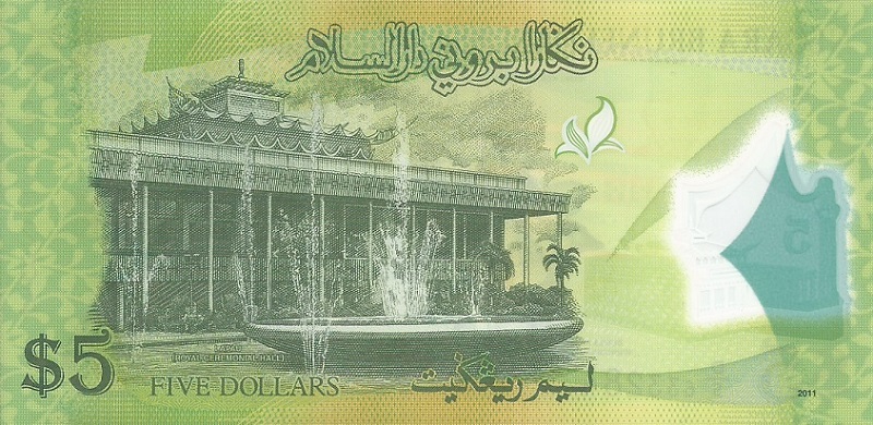 2011. Olive and green on multicolored underprint. Sultan Hassanai Bolkiah at right, pitcher plant at center. Back: Lapau - Royal Ceremonial Hall at center. Polymer plastic.