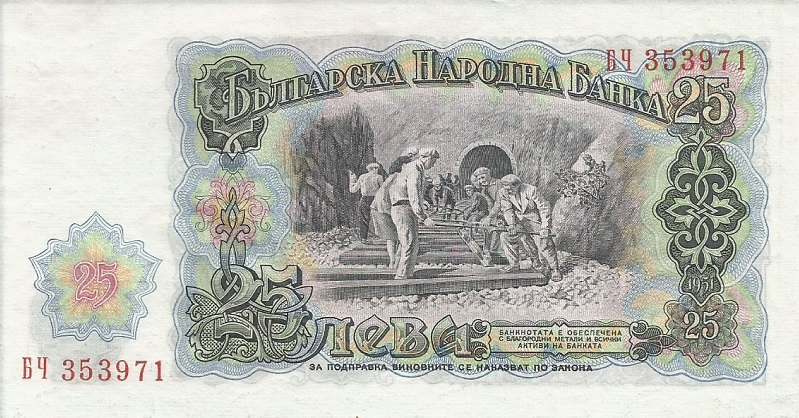 1951. Gray blue on multicolor underprint. Railroad construction at center. Back: G. Dimitrov at left, arms at right. Watermark: BNB with hammer and sickle.