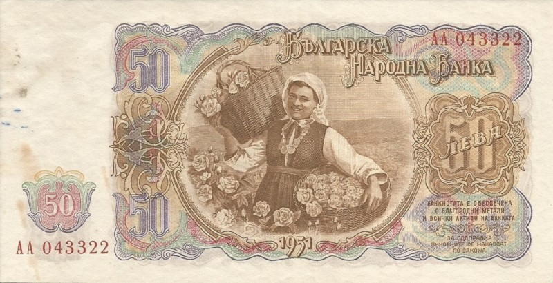 1951. Brown on multicolor underprint. Peasant woman with baskets of roses at center. Back: G. Dimitrov at left, arms at right. Watermark: BNB with hammer and sickle.