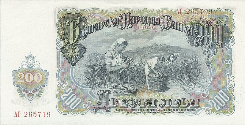 1951. Gray-blue and black on multicolor underprint. Farmers harvesting tobacco at center. Back: G. Dimitrov at left, arms atright. Watermark: Hammer and sickle.