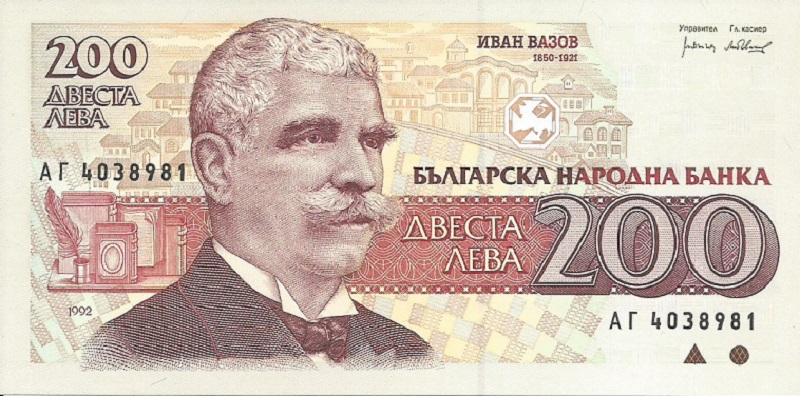 1992. Deep violet and brown-orange on multicolored underprint. Ivan Vazov at left, village in underprint. Lyre with laurel wreath at right on back.