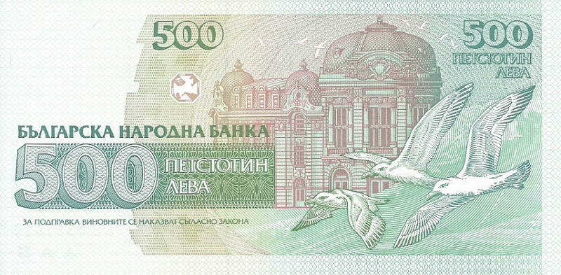1993. Dark green and black on multicolored underprint. D. Christov at left and as watermark. Opera house in Varna at center right, herring gulls at lower right on back.
