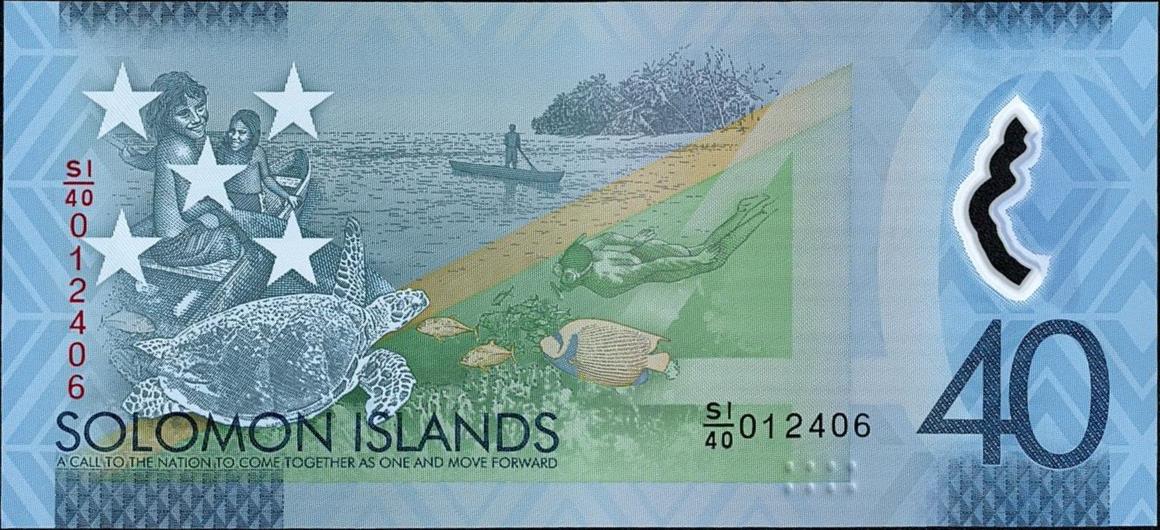 ND (2019). Blue on blue and ocher underprint. On the front of the note you’ll see the beautiful coral reefs that surround the Solomon Islands form the inspiration for the colour, patterns and texture that appear on the note. With the reef below and the surface above, a Yellowfin Tuna fiercely battles the fisherman who makes the catch with a traditional hook. The scene of the fish and the hook is used to create large clear windows — unique to polymer banknotes. When it catches the light a colour shift from the amber of the fish and the green of the rippled sea and hook both shift to blue. This effect extends to the two large windows at the opposite end whose design is inspired by traditional wood carvings. On the back of the note is a spear fishing scene that illustrates the sense of community and social cohesion that fishing brings while respecting the environment and preserving our marine world for those who follow.