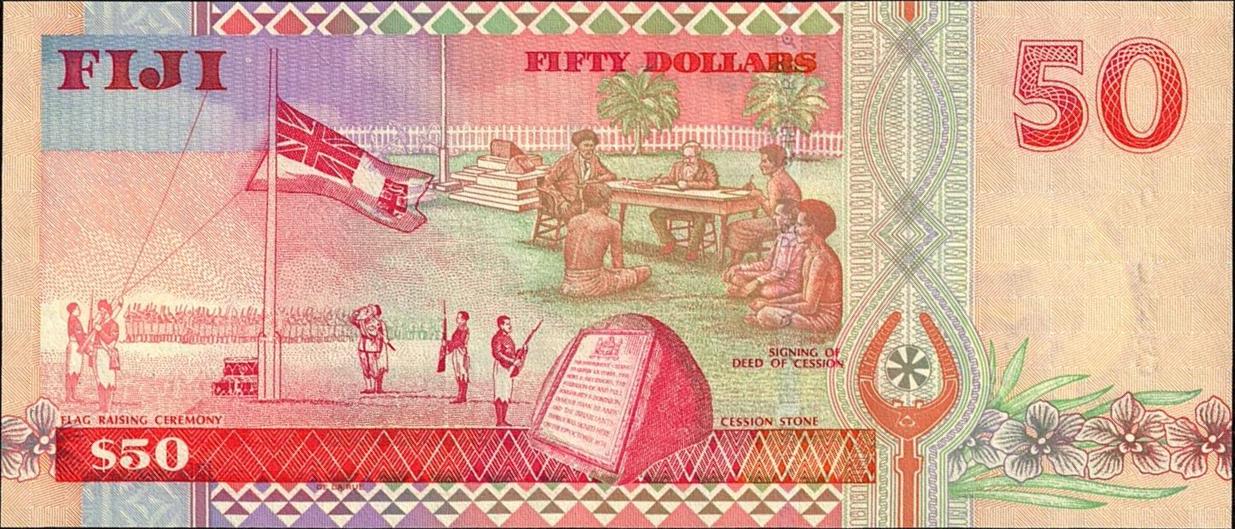 ND (1996). Black, red, orange, and violet on multicolored underprint. Mature bust of Queen Elizabeth II at right, arms at upper right. Kaka bird at lower left. Flag raising cerimony at left, signing of the Deed of Cession over the Cession Stone at center right on back. Segmented security thread. Watermark: profile of Fijian head. Printer: TDLR. Serial number prefix K.