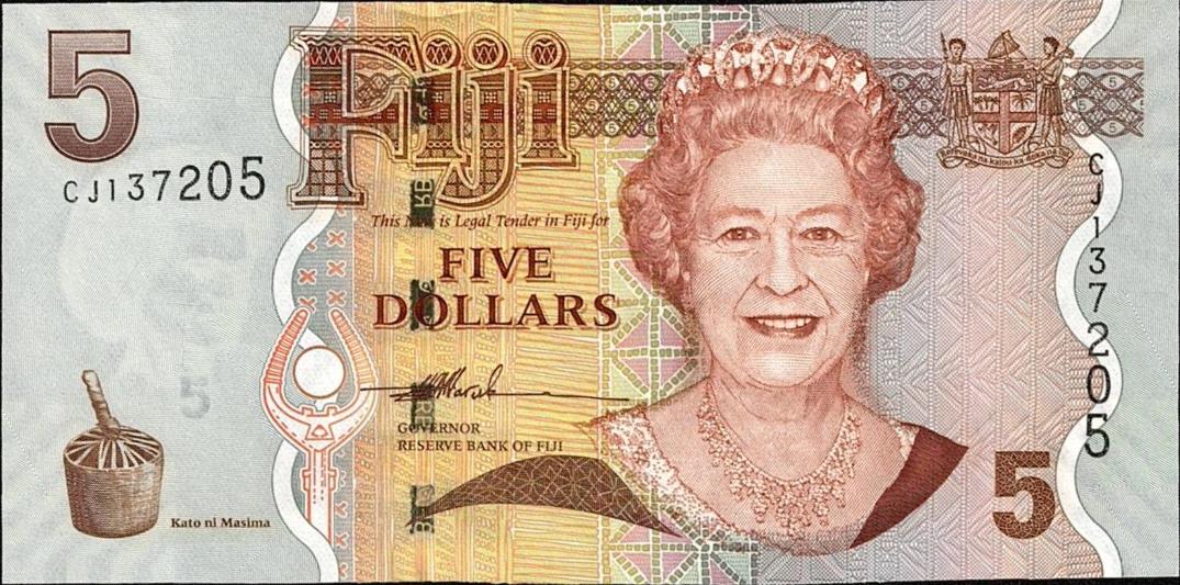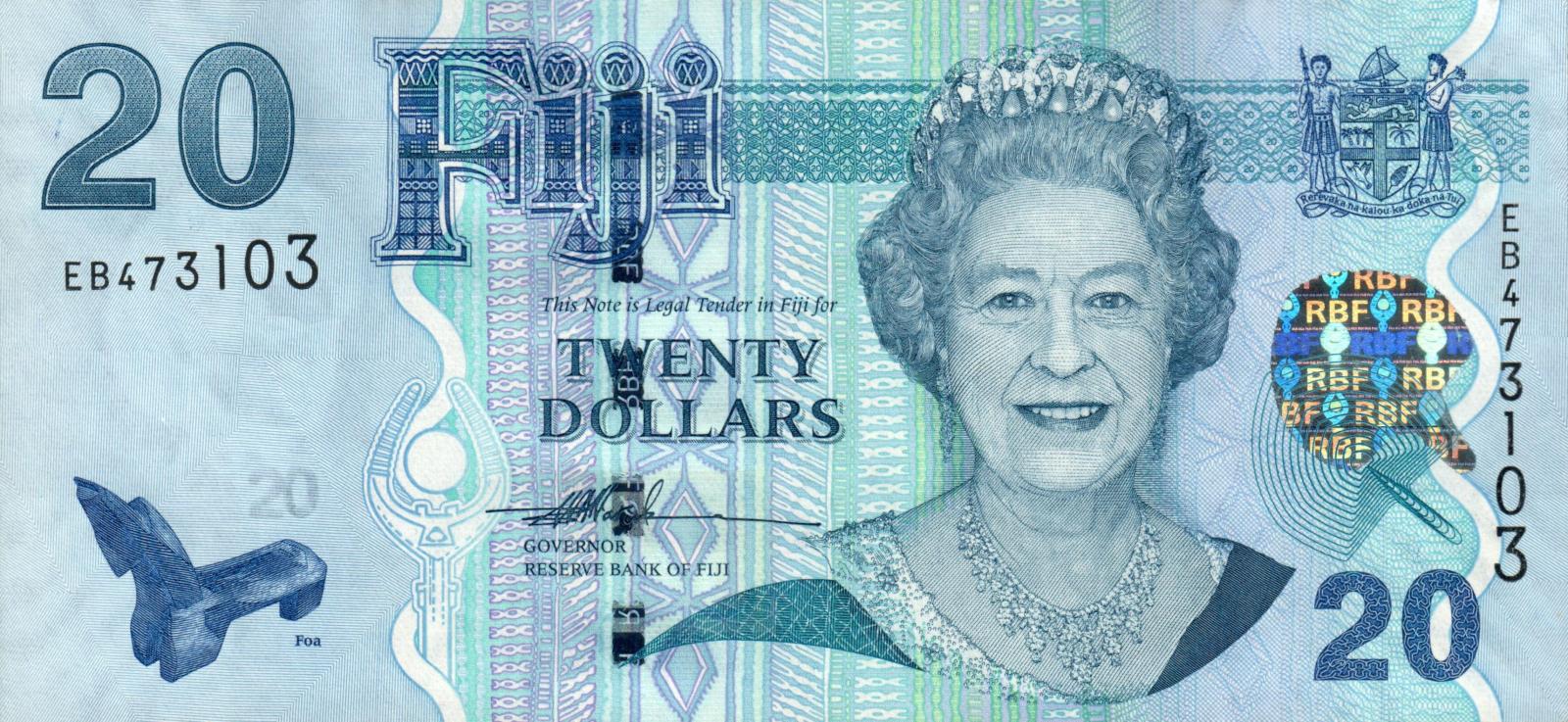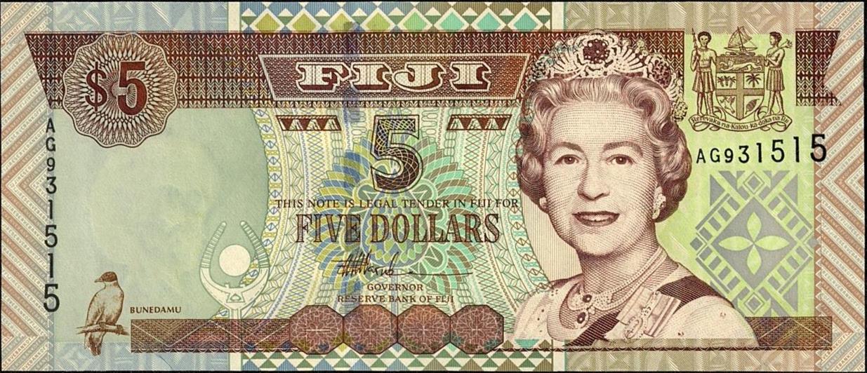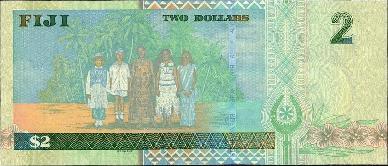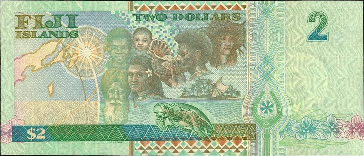 ND (1996). Purple, violet, and brown on multicolored underprint. Mature bust of Queen Elizabeth II at right, arms at upper right. Kiau bird at lower left. Children swimming at left in background, family in boat constructed of reeds with thatched roof shelter at left center on back. Segmented security thread. Watermark: profile of Fijian head. Printer: TDLR. Double letter prefix.