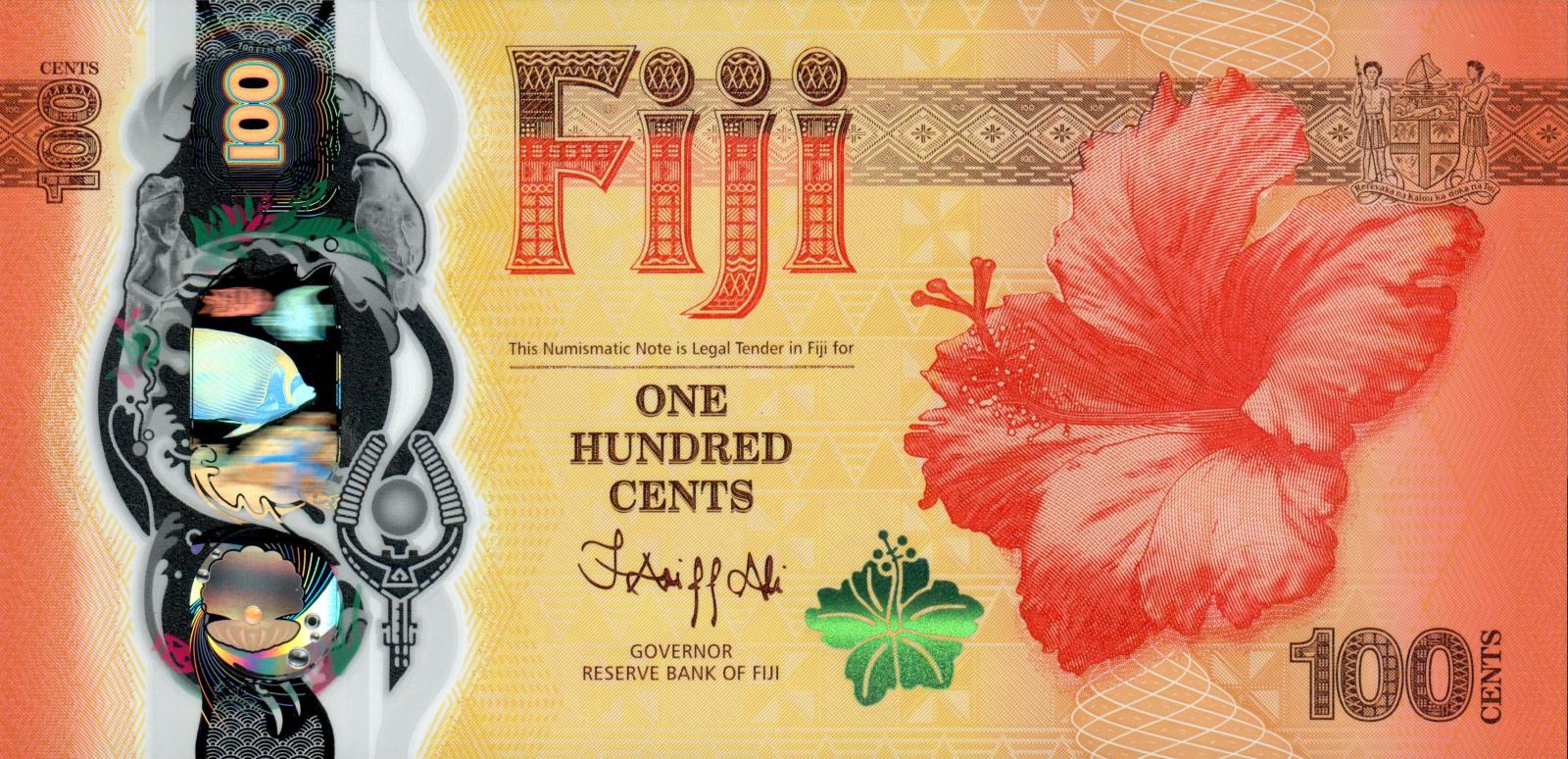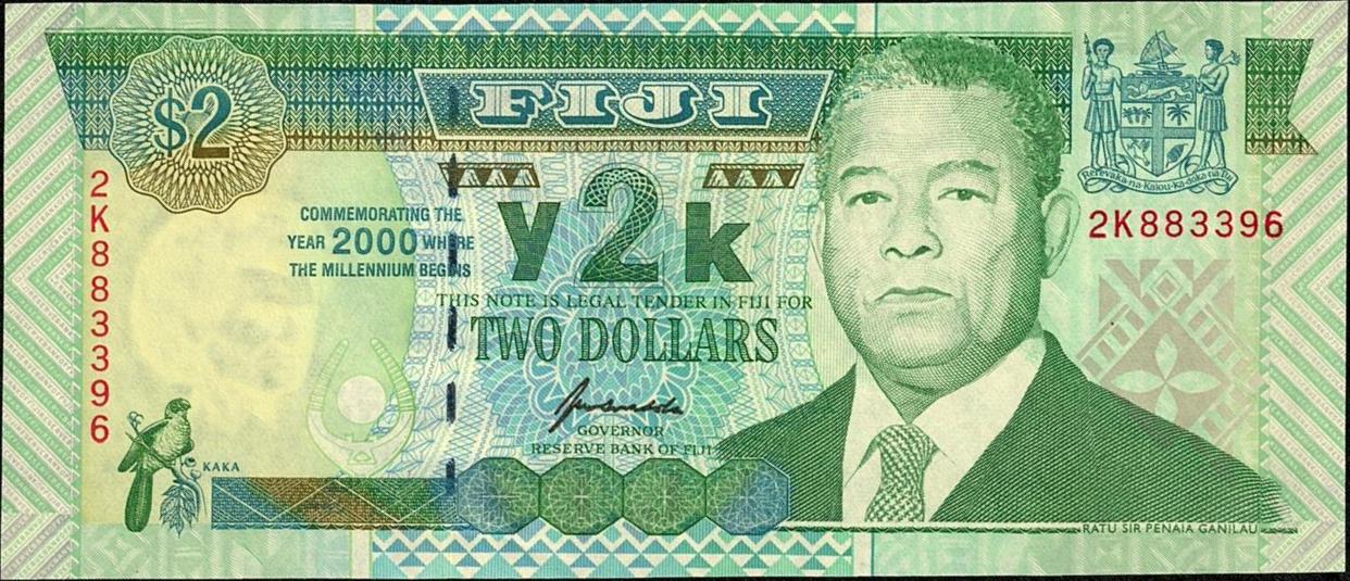 2000. Green and blue on multicolored underprint. Kaka bird at left, Sir Penaia Ganilau at right. Arms at upper right. Group of islanders and turtle on back. Y2K at center. Segmented foil security thread. Watermark: profile of Fijian head.