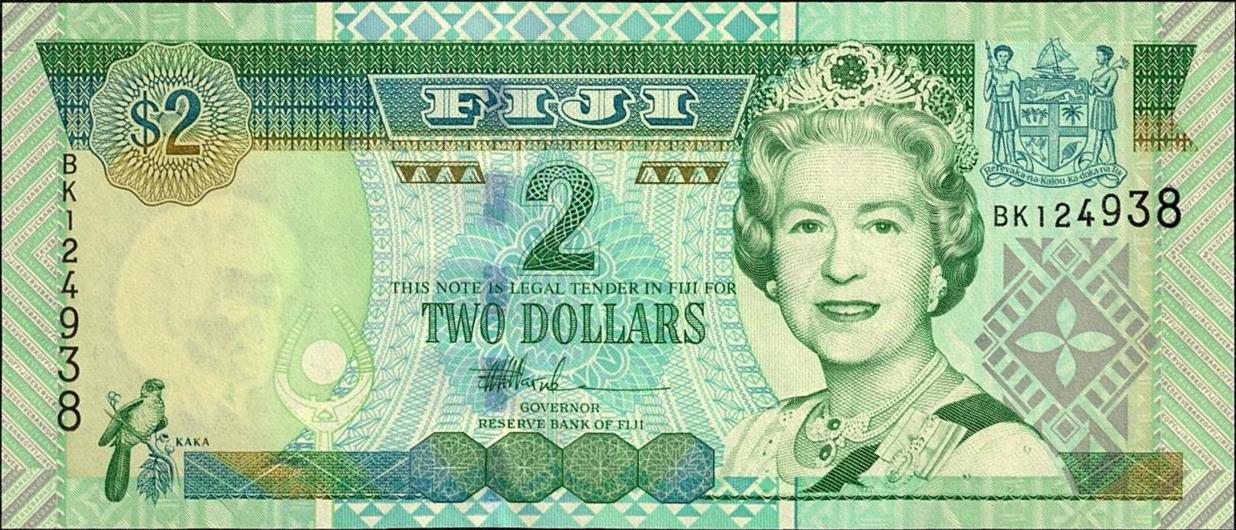 ND (2002). Dark green, blue, and olive-brown on multicolored underprint. Mature bust of Queen Elizabeth II at right, arms at upper right. Kaka bird (Masked Shining Parrot) at lower left. Fijian family of five at left center on back. Ascending size serial number. Watermark: profile of Fijian head. Printer: TDLR. Double letter prefix.