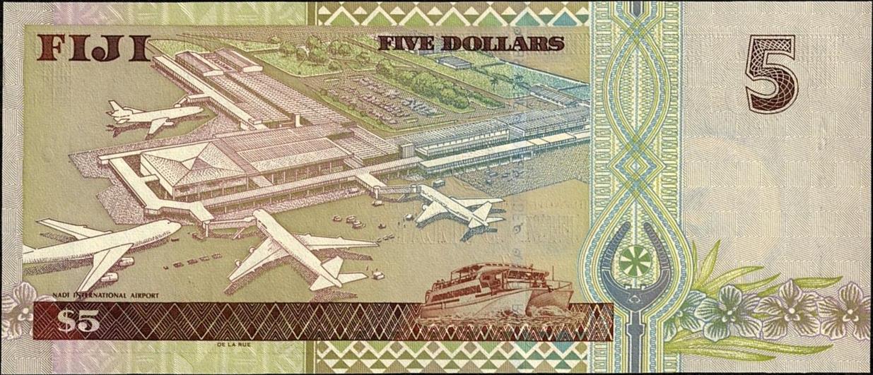 ND (2002). Brown-orange on violet and multicolored underprint. Mature bust of Queen Elizabeth II at right, arms at upper right. Bunedamu bird (White-throated pigeon) at lower left. Aerial view of Nadi International Airport at left center, ferry boat at lower center right on back. Ascending size serial number. Watermark: profile of Fijian head. Printer: TDLR. Double letter prefix.
