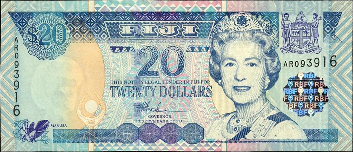 ND (2002). Blue, purple, and dark blue on multicolored underprint. Mature bust of Queen Elizabeth II at right, arms at upper right. Manusa bird at lower left. Parliament House at left, Reserve Bank building at center right on back. Ascending size serial number; hologram to right of Queen. Watermark: profile of Fijian head. Printer: TDLR. Double letter prefix.