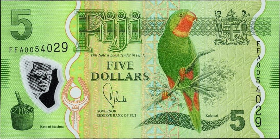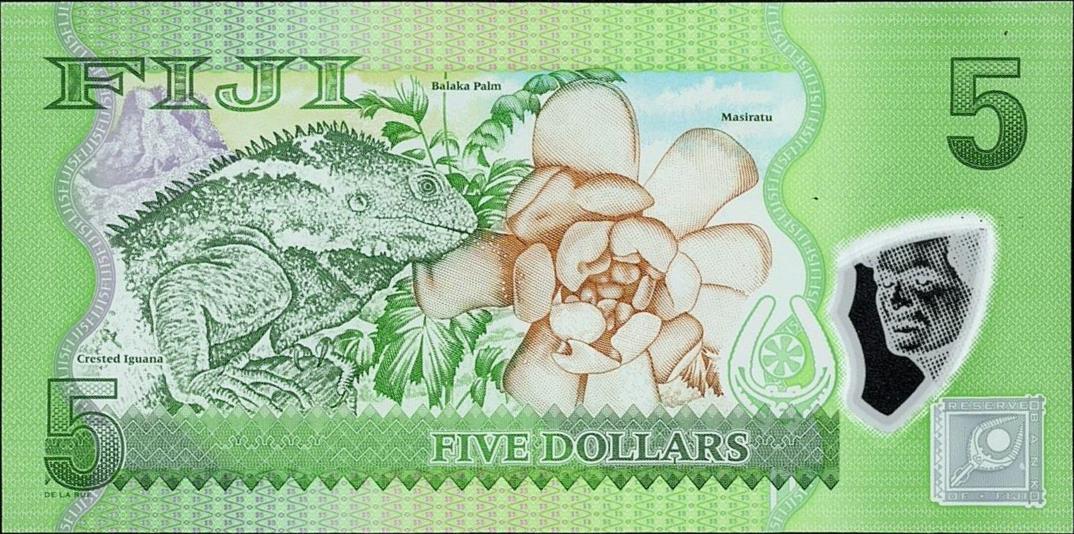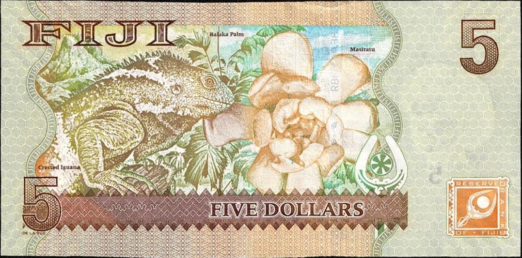 ND (2013). Polymer plastic banknote. Green on multicolored underprint. Endemic Kulawai (Red throated Lorikeet) at right, arms at upper right. Clear window with images of i-Taukei at left. Kato ni Masima (salt basket) at lower left. The back of this banknote features a crested iguana at left, and a Balaka palm at center. Masiratu flower at right. Mount Valili at far left.