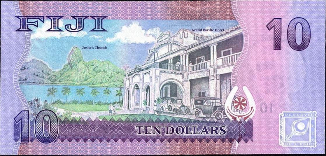 ND (2013). Purple on multicolored underprint. Beli fish (Lever's Goby) at right, arms at upper right. A Baburau-ni-bete (duck dish) at lower left. Back features the Grand Pacific Hotel at right center, and Joske's Thumb at left. Printer: DLR.
