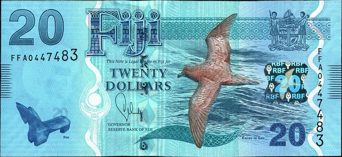 ND (2013). Blue on multicolored underprint. Kacnu ni Gau bird (Fijian Petrel) at right, with arms at upper right. Foa (a coconut scraper) at lower left. Back of the banknote features forestry, sugarcane and mining scenes, with Mount Uluinabukelevu at upper right center. Printer: DLR.