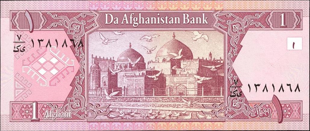 Dark brown and deep red-violet on multicolored underprint. Mosque at Mazar-e-Sharif at right. Victory Arch near Kabul at left center on back.