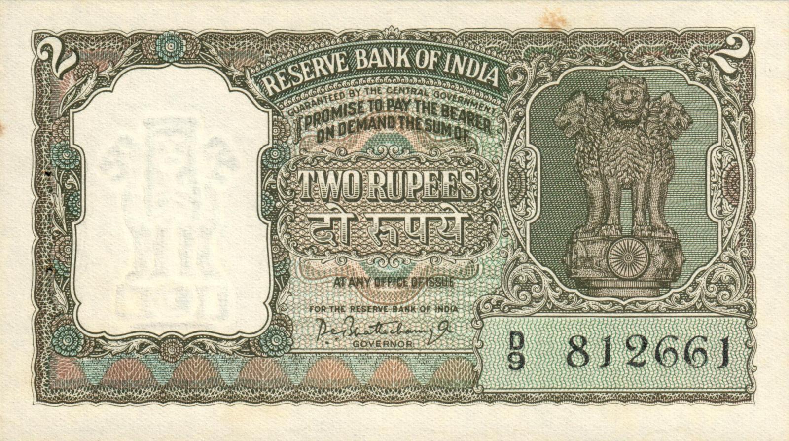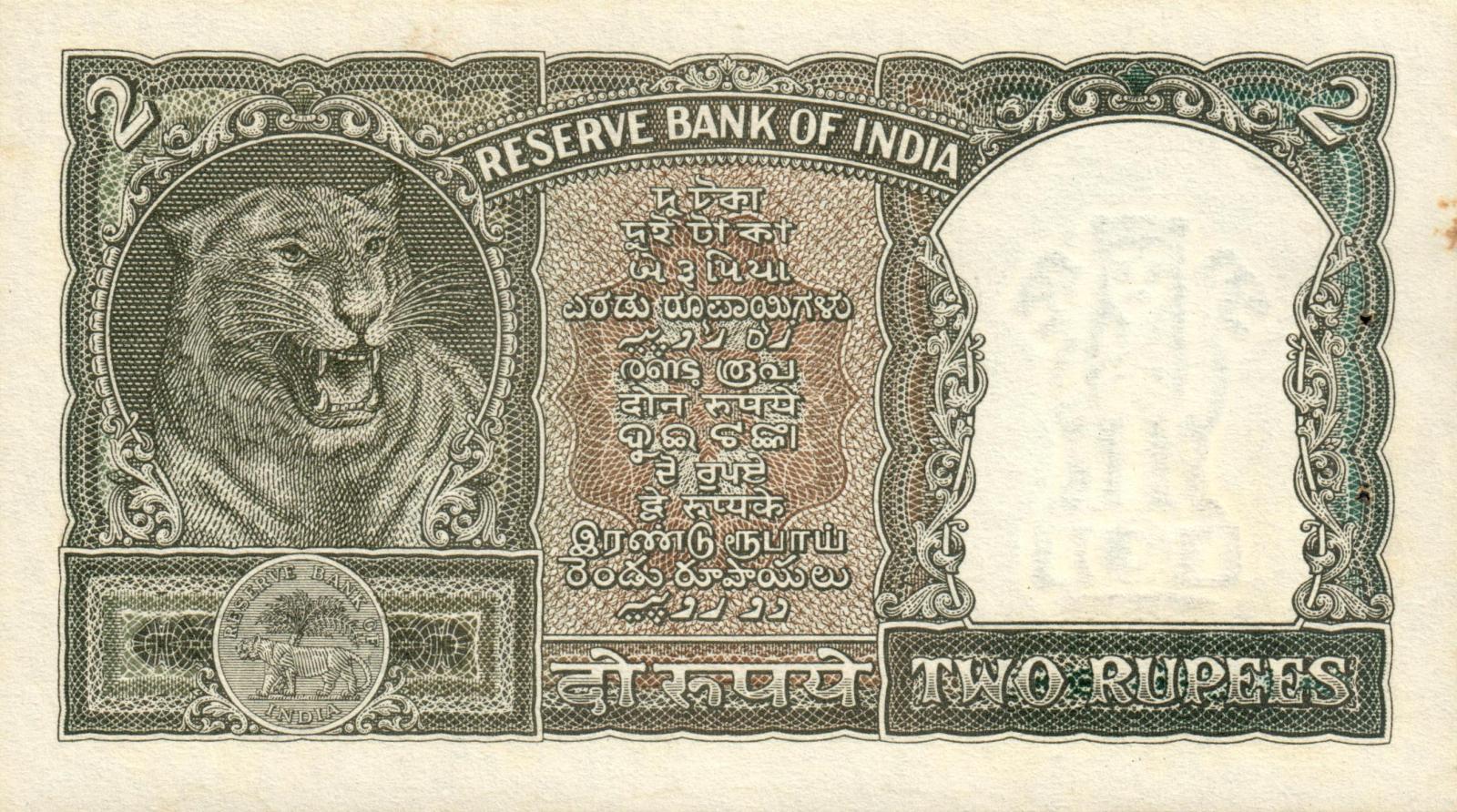 ND. Red-brown on violet and green underprint. Tiger head at left on back. Value in English and error Hindi on face and back. English numeral 2 at upper left and right. Seven value test lines on back; third line 18mm long.