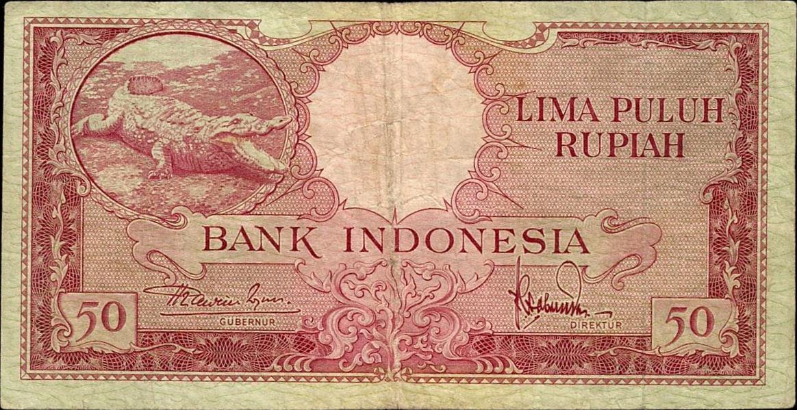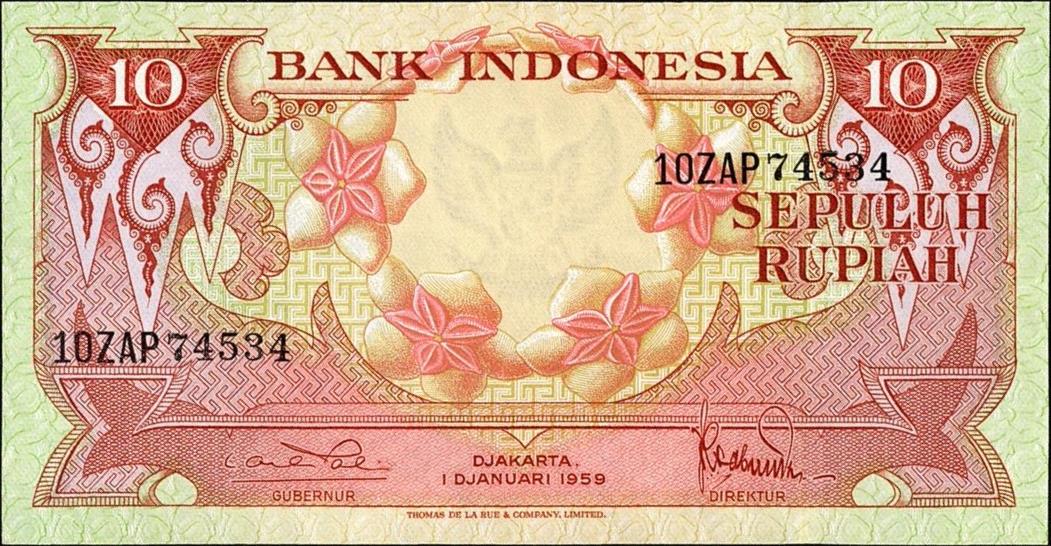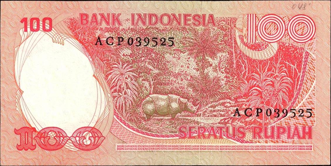 1977. Red on multicolored underprint. Java Rhinoceros at left. Java Rhinoceros in jungle scene at center on back. Watermark: arms.