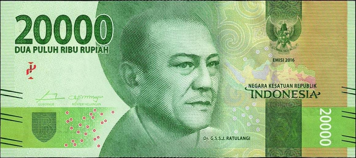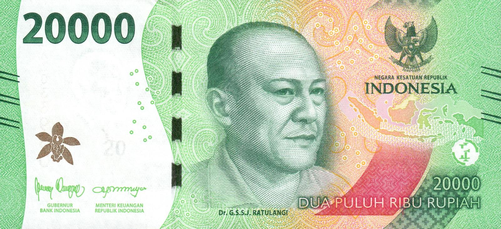 Emis 2022 (17th of August, 2022). Green on green and yellow underprint. The obverse portrays the national hero of the Republic of Indonesia, Dr G.S.S.J. Ratulangi, as the main image. The national emblem of Garuda Pancasila is also featured along with images of the Indonesian Archipelago, the Black Orchid (coelogyne pandurata) and several motifs native to Indonesia. The reverse portrays the Gong Dance set against the natural beauty of the Derawan Islands, combined with the elegance of the Black Orchid (coelogyne pandurata). In addition, several motifs native to Indonesia adorn the reverse of the Rp20,000 banknote. Watermark: Dr G.S.S.J. Ratulangi.
